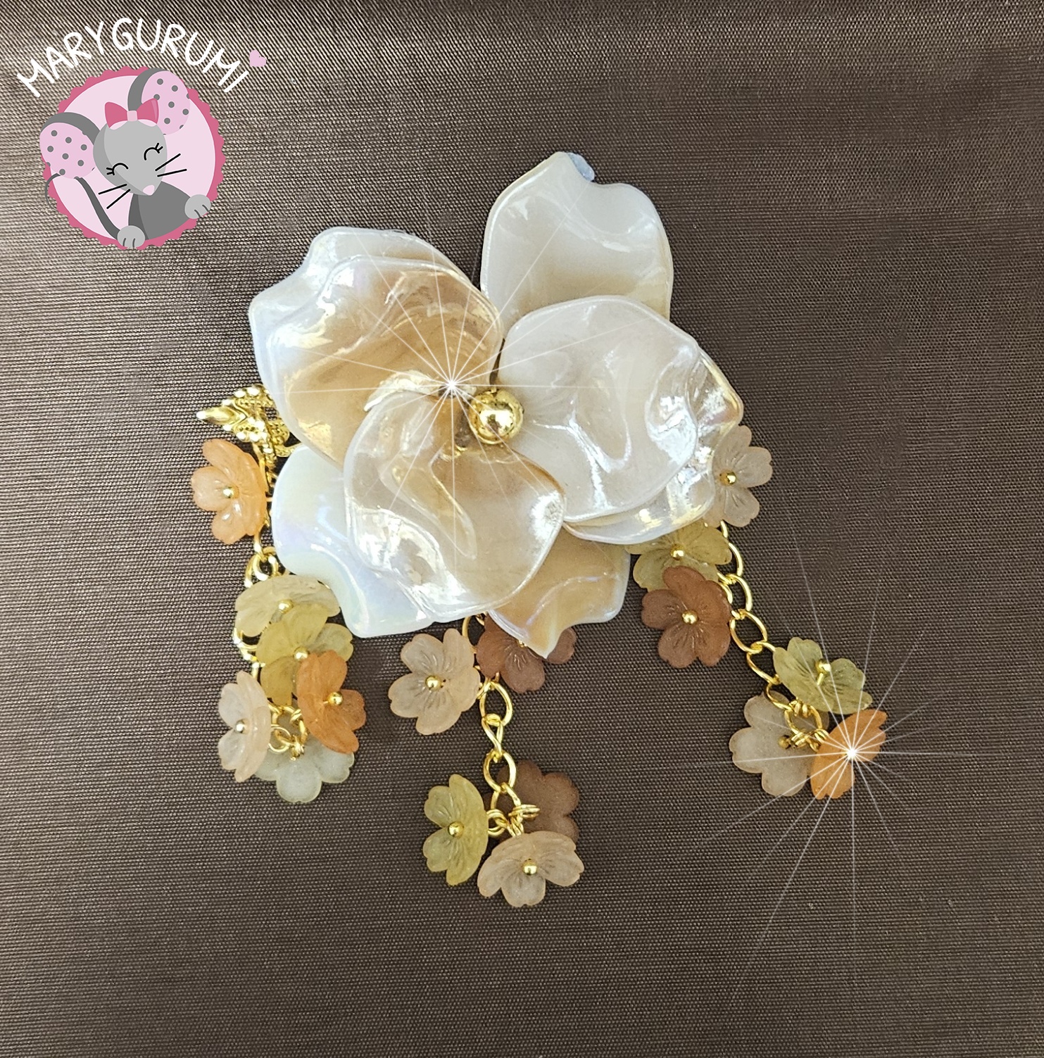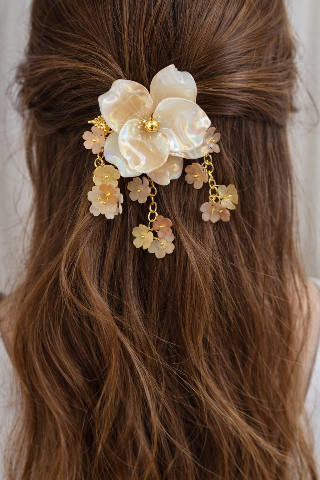 Bijou de cheveux fait main d’environ 8 cm, composé d’une fleur centrale aux pétales nacrés accompagnée de délicates chaînettes dorées ornées de petites fleurs translucides, une création élégante et poétique qui apporte une touche raffinée et lumineuse à la coiffure.