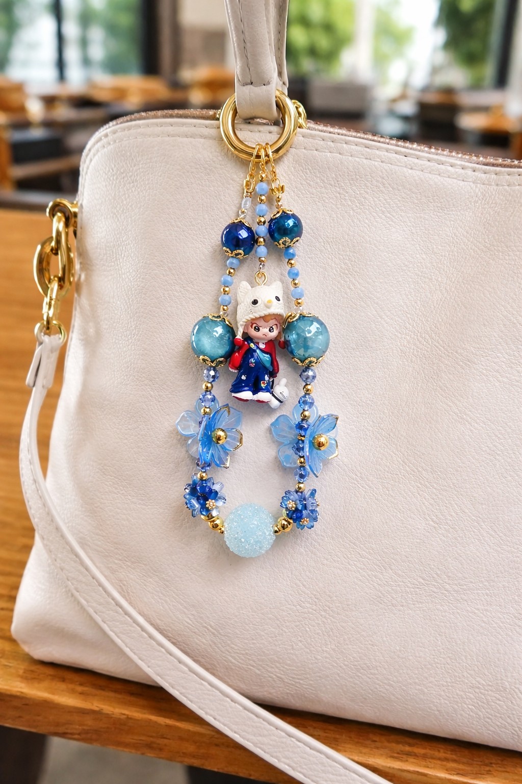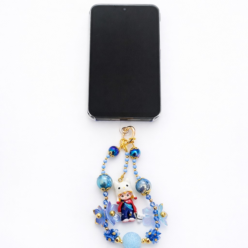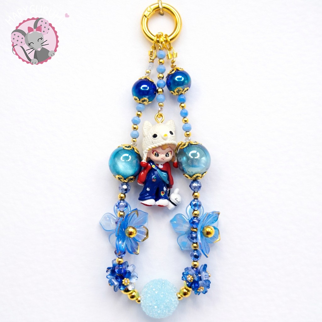 Bijou de sac fait main, composé de perles bleutées lumineuses et de délicates fleurs, avec un adorable personnage central. Polyvalent, il peut aussi être utilisé comme bijou de téléphone, pour apporter une touche poétique, originale et pétillante à ton quotidien.